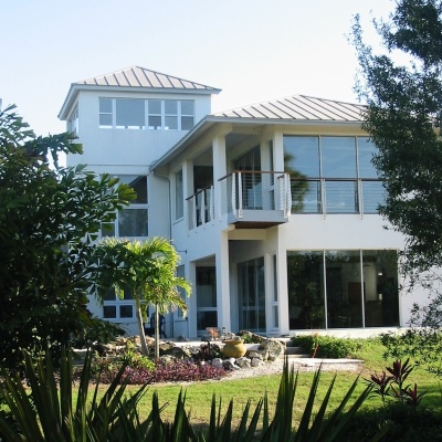 Situated on a ¾” acre property in Northeast St. Petersburg, Florida, this 4875 sq ft, 3 story, Contemporary / Key West Style home overlooks a 62 acre Natural Preserve at Weedon Island. The projects main organizing element is a two story high concrete exposed wall. This wall helps the projects design take full advantage of the integration of passive design ideas through orientation of sun, shading devices, and its use of natural summer breezes. The Residence is complimented by energy efficiency through environmental technologies while employing green building ideas. The home is equipped with Energy Star appliances and equipment, highly insulated walls and ceilings, and its use of supplement LP gas, making energy savings a focus. The property is over 300 ft deep which allows for a meandering, natural oyster shell, driveway, cut though native trees and foliage before making its approach to the front entry breezeway. The home emphasis and outward focusing parti is built around a large 4000 sq ft courtyard. The entry breezeway separates the main living quarters from a 2 story cabana building for parties and or home office. The main living quarters is a large 2 story space incorporating many nautical and contemporary flavors such as ship cable railings, exposed spiral ductwork and chem-stained, polished concrete gridded floors. The third story observation tower is equipped with a spiral stair for viewing 270 degrees of natures preserve and the overall sites sub-tropical landscape and up-lighting.
